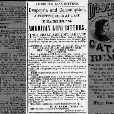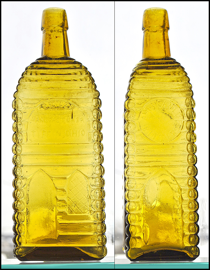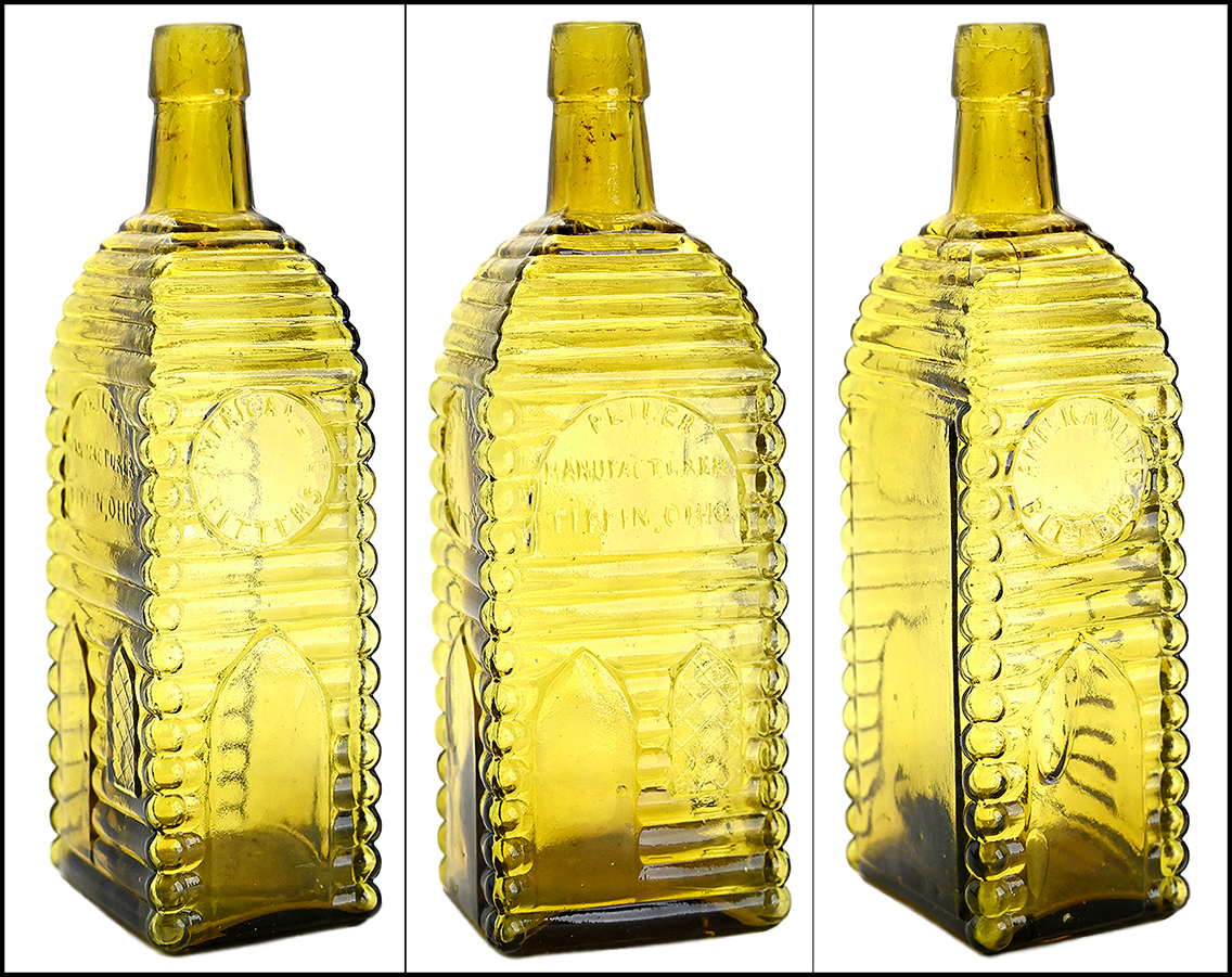 1. "AMERICAN LIFE / BITTERS - P.E. ILER / MANUFACTURER / TIFFIN, OHIO. - AMERICAN LIFE / BITTERS", (Ring/Ham, A-49), Ohio, ca. 1865 - 1875, light to medium olive yellow cabin, 9 1/8h, smooth base, applied tapered mouth.