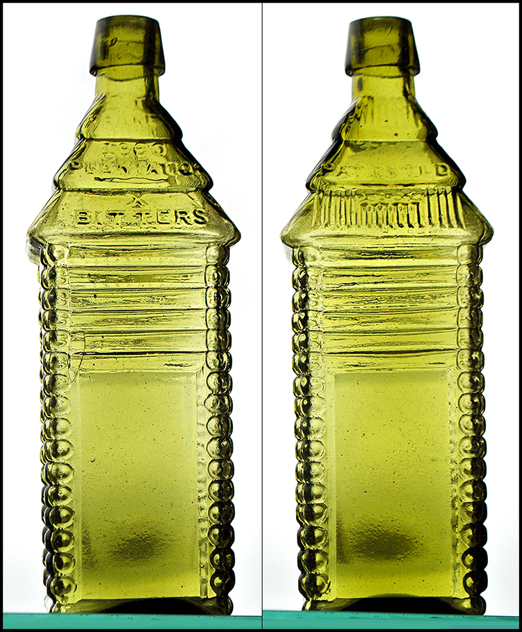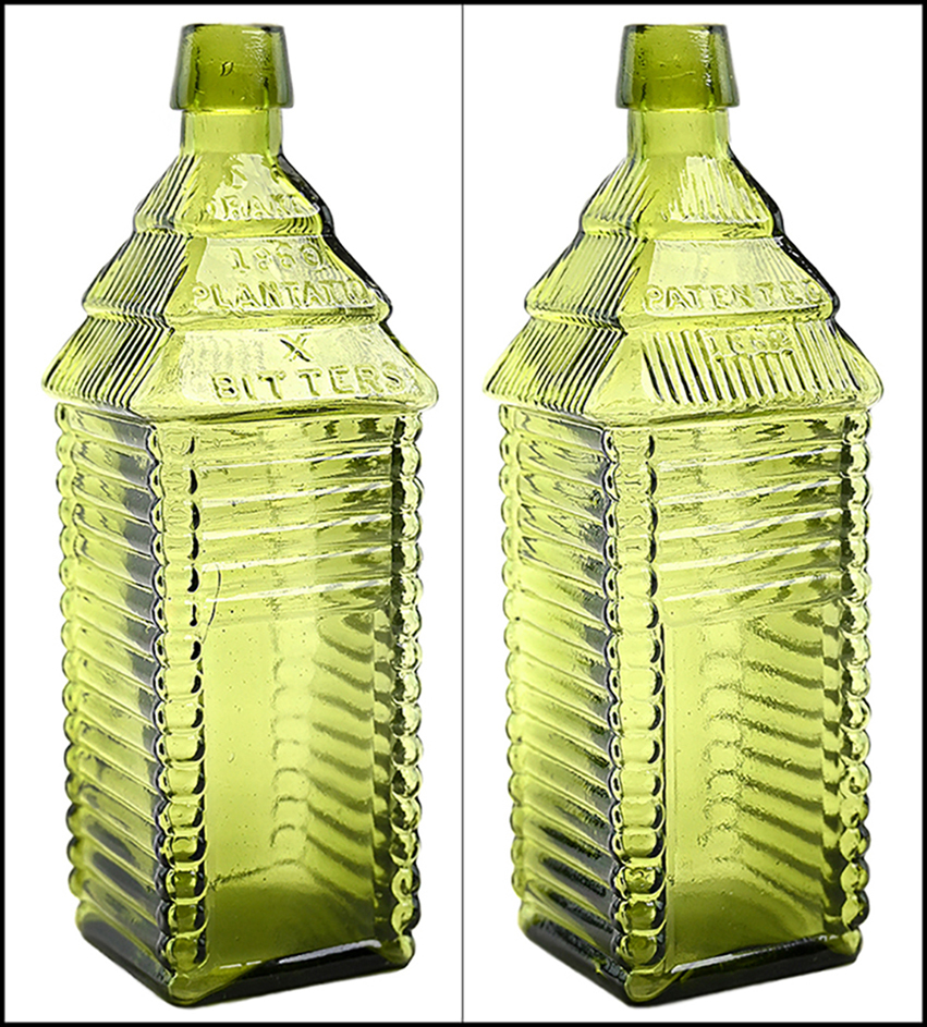 1. "ST / DRAKE'S / 1860 / PLANTATION / X / BITTERS - PATENTED / 1862", (Ring/Ham, D-108), New York, ca. 1862 - 1875, light to medium celery green 6-log cabin, 9 7/8"h, smooth base, applied tapered collar mouth.