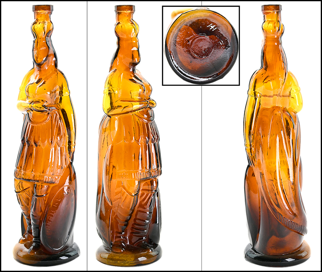 1. "E. LONG'S / INDIAN HERB BITTERS", (Ring/Ham, L-119), American, ca. 1870 - 1875, yellowish amber Indian Princess, 12 1/8"h, smooth base, applied mouth. Perfect condition but some dried base contents should wash out. Due to a shallow cut mould (like all) the impression is weak.